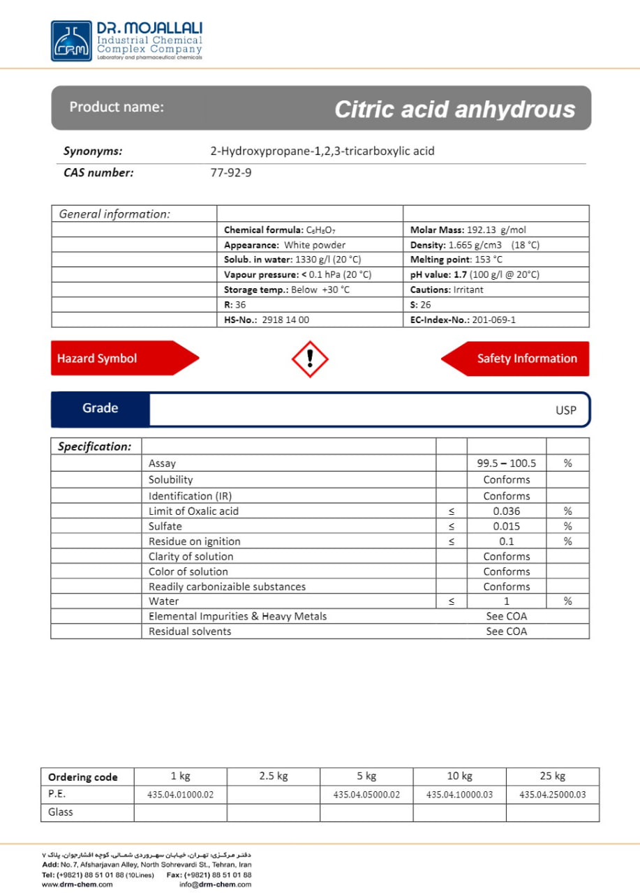 جهت خرید اسید سیتریک گرید USP می توانید به سایت nanosany.com مراجعه نمایید تا بتوانید به صورت آنلاین و مطمئن در کمترین زمان ممکن سفارش خود را ثبت نمایید. انواع گرید ها با برندهای متنوع در فروشگاه اینترنتی نانوثانی موجود میباشد همچنین راهنمای تصویری به صورت مرحله به مرحله در صفحه خرید هر ماده شیمیایی بارگذاری شده است که مشتریلن عزیز میتوانند به راحتی سفارش خرید خود را ثبت نمایند و هر کجای ایران که هستند تحویل بگیرند.