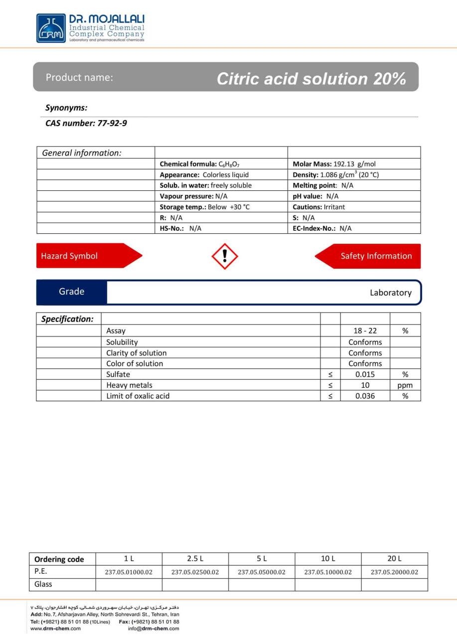 اسید سیتریک محلول 20% :