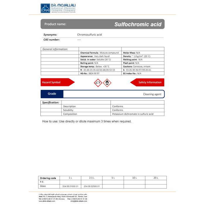 محلول اسید سولفوکرومیک (SULFOCROMIC ACID) محلول ترکیبی است که کاربرد آن بیشتر در سطح آزمایشگاهی میباشد.