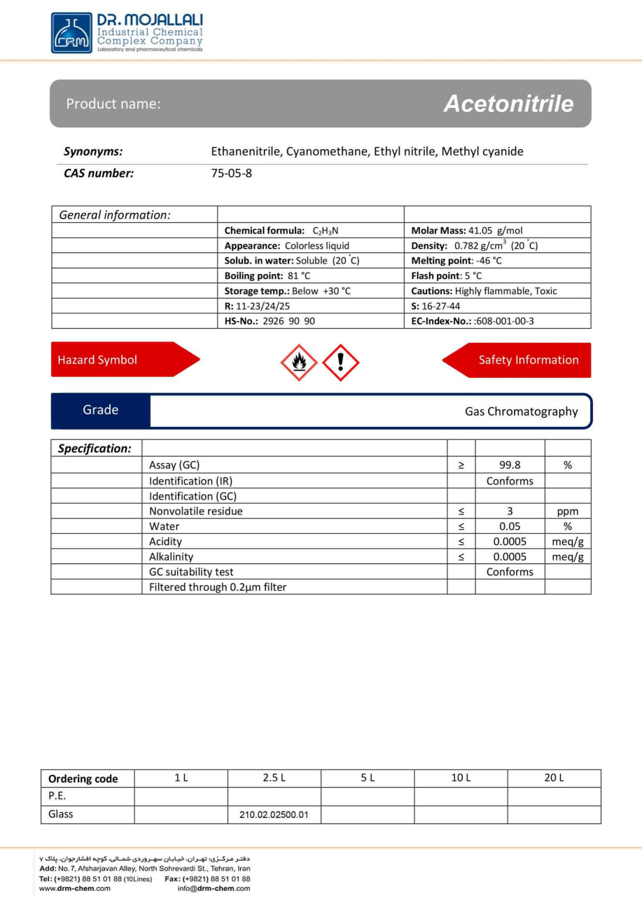 مشخصات کلی استونیتریل مرک:
