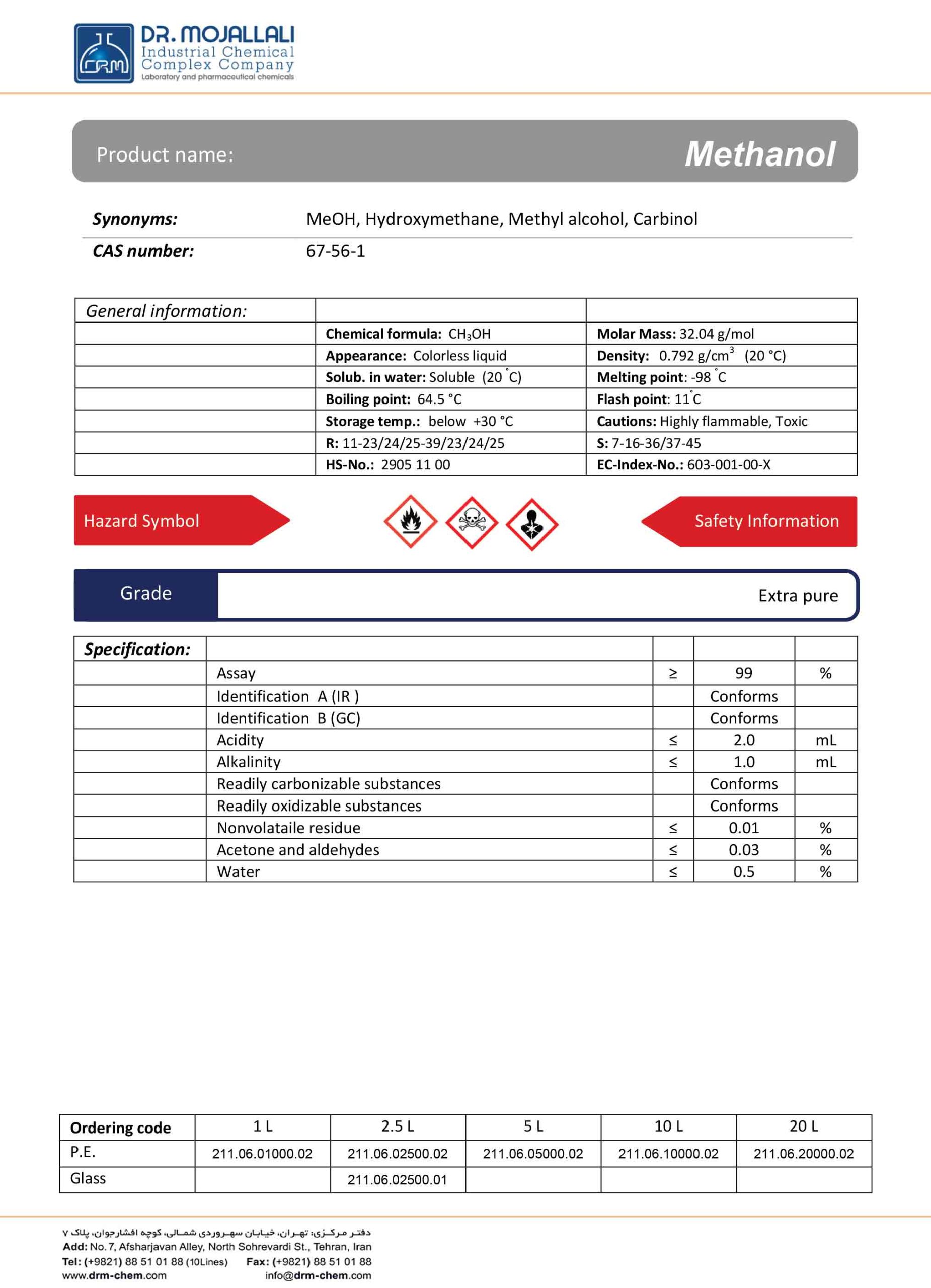شرکت پیشگامان نانومواد ایرانیان (نانوثانی)، بانک جامع مواد شیمیایی، ارائه دهنده متانول در گرید های مختلف با کیفیت عالی و قیمت مناسب در انواع گرید، سایز و بسته بندی به دانشجویان، محققان و صنایع می باشد.