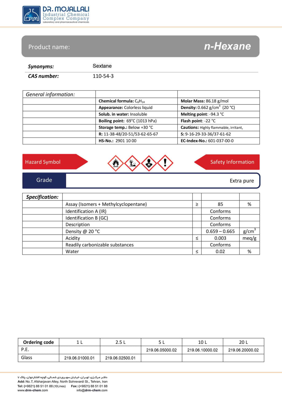 نکته مهم: هنگام خرید ان هگزان، به درجه خلوص آن توجه کنید. ان هگزان با خلوص بالا (Extra Pure) برای کاربردهای آزمایشگاهی و حساس مناسب است.