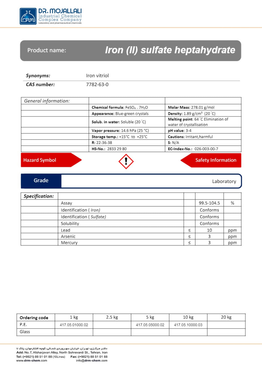 معرفی محصول آهن (II) سولفات هیدراته آزمایشگاهی