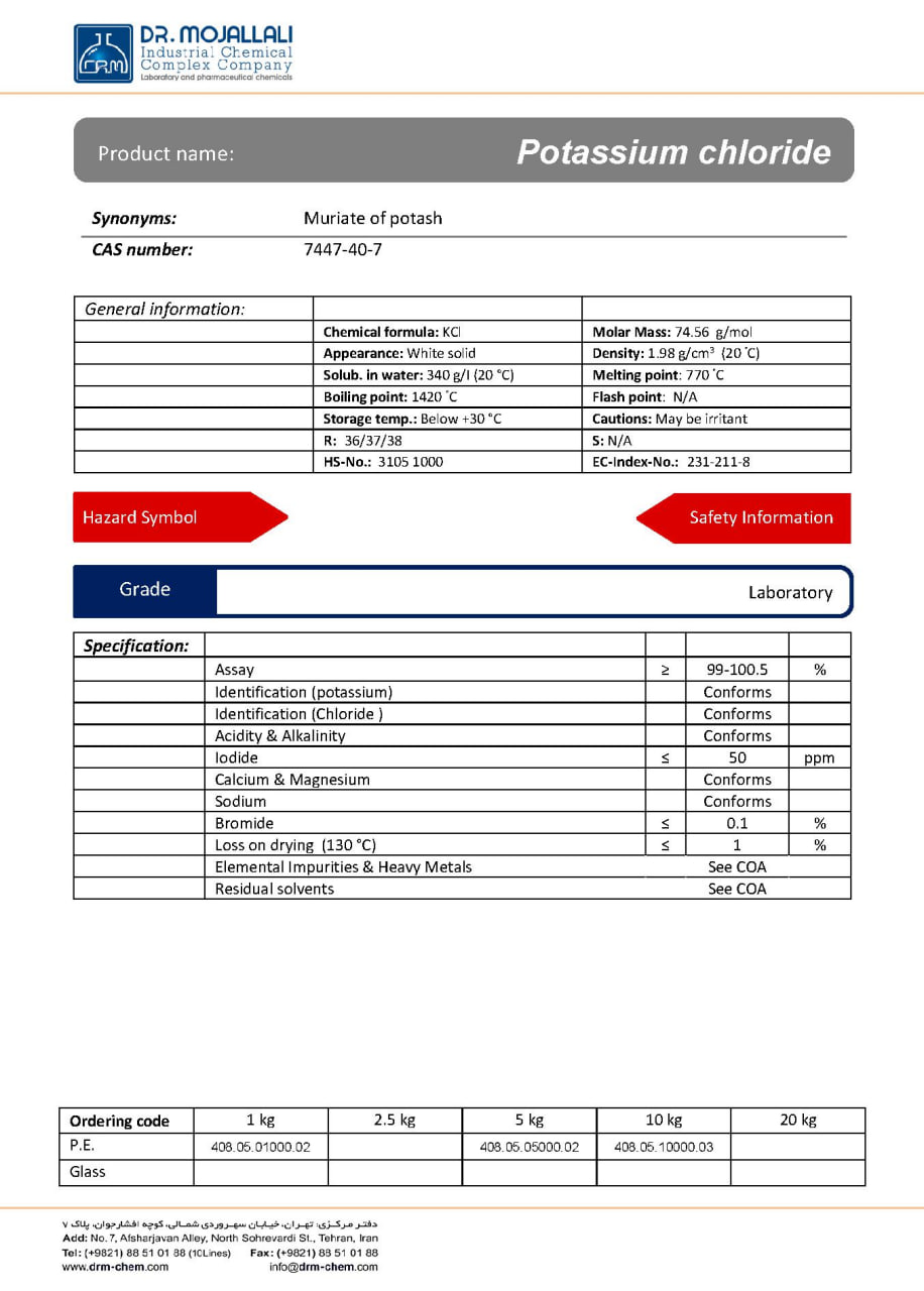 یکی از مزیت های فروشگاه نانوثانی آن است که مشتری عزیز برای خرید مواد شیمیایی از جمله خرید پتاسیم کلراید چندین گزینه پیش رو دارد. قیمت کلرید پتاسیم دکتر مجللی در این صفحه قابل مشاهده است. حال می توان قیمت پتاسیم کلراید نوترون را نیز مشاهده نموده و با توجه به نیاز نسبت به خرید اقدام نمود. برای مقایسه قیمت پتاسیم کلراید از تولیدکنندگان مواد شیمیایی، می توانید آنها را به لیست افزودن جهت مقایسه اضافه نمایید و اینطور براحتی قیمت کلرید پتاسیم از هر سه تولیدکننده یکجا در کنار هم قابل مشاهده و مقایسه است.